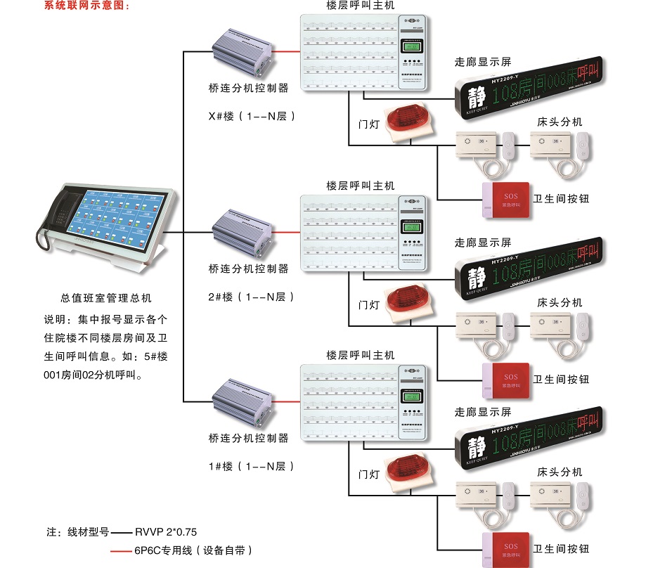 该系统通过2芯线组网方式将若干栋楼,若干层的护理值班室联网,也可以将多个科室的值班室汇总集成到一个总值班室一台主机上集中管理服务,可完成呼叫接听、指挥、调度、监控等功能,免去了在各栋楼、各病区、各楼层安排的值班室、护理站及相关值班人员,改变了大型医院、疗养院多病区、多楼层传统的分散求助呼叫模式。既减轻了护理人员的劳动强度,又省掉了人员调配的费用开支,更提升了医疗机构的高科技的管理水平。