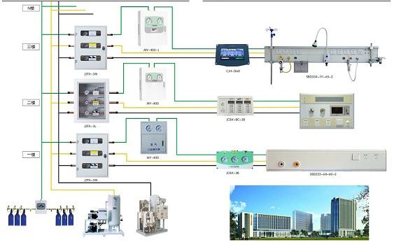 管网系统有主管道、分管道、支管道等构成。管网系统按压力管道设计要求进行优化设计,精良选材;配置氧气二级稳压箱、氧气流量仪、报警装置、区域切断阀门、氧气终端等。为了监测各病区气体的使用压力情况,确保系统安全运行,在每个病区的护士站安有一台监测装置来监测各病区的压力,保证每个病区其气体压力不低于或超过使用压力,以实现连续稳定的供氧,压力表精度不低于1.5级。