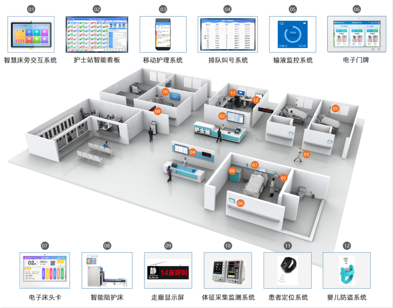 澳环智慧病房整体解决方案主要以智慧床旁交互系统为核心,构建护士站智能看板、移动护理系统、电子门牌、电子床头卡、输液监控系统、智能陪护床、走廊显示屏、体征监测采集系统、全数字医护对讲信息服务系统、移动医生查房系统。